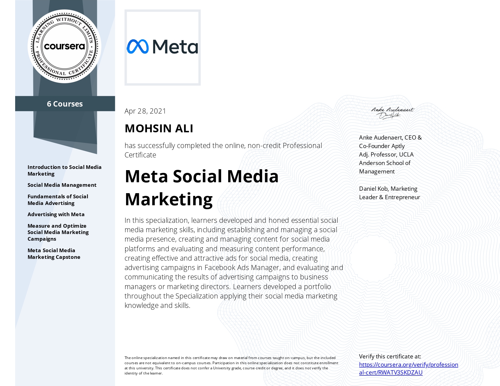 This specialization focuses on developing essential social media marketing skills, including managing social media presence, creating and managing content, and evaluating advertising campaigns. Learners will develop a portfolio applying their social media marketing knowledge.