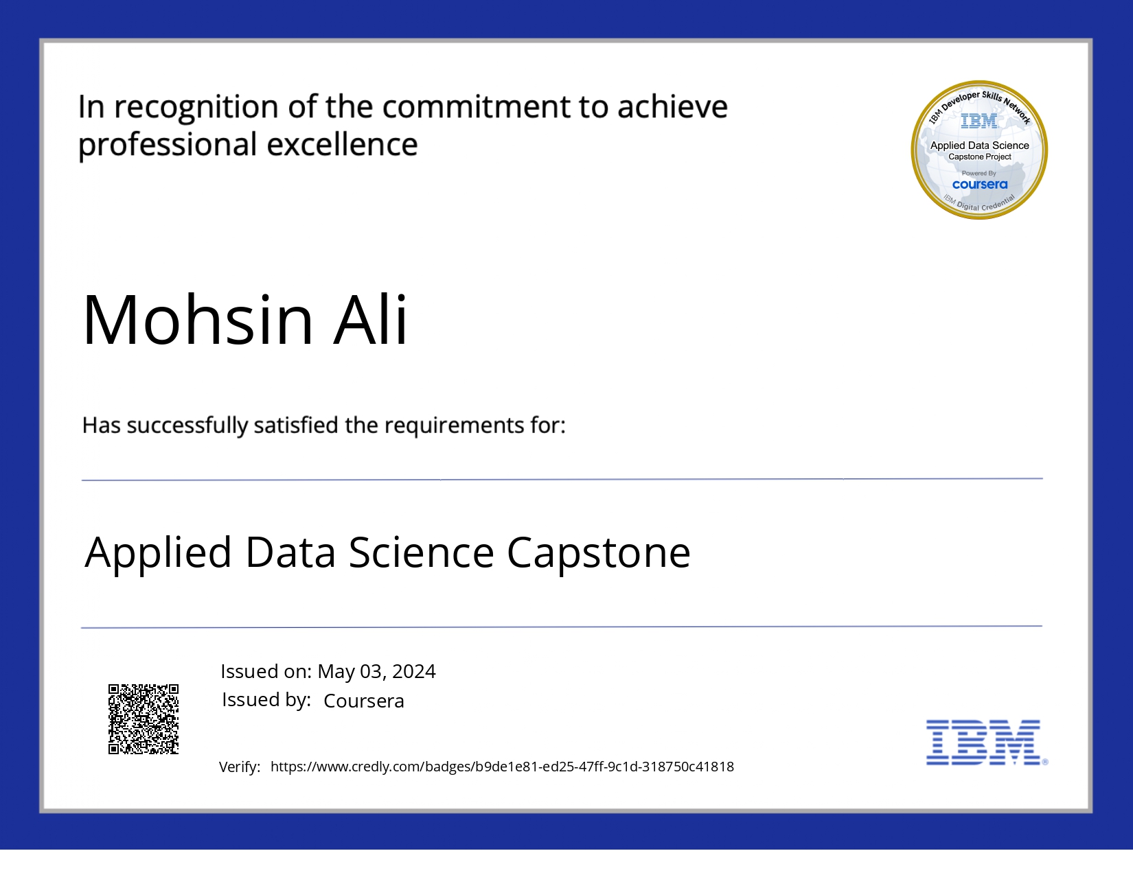 This certificate recognizes the successful completion of the Applied Data Science Capstone project, demonstrating proficiency in practical data science applications.