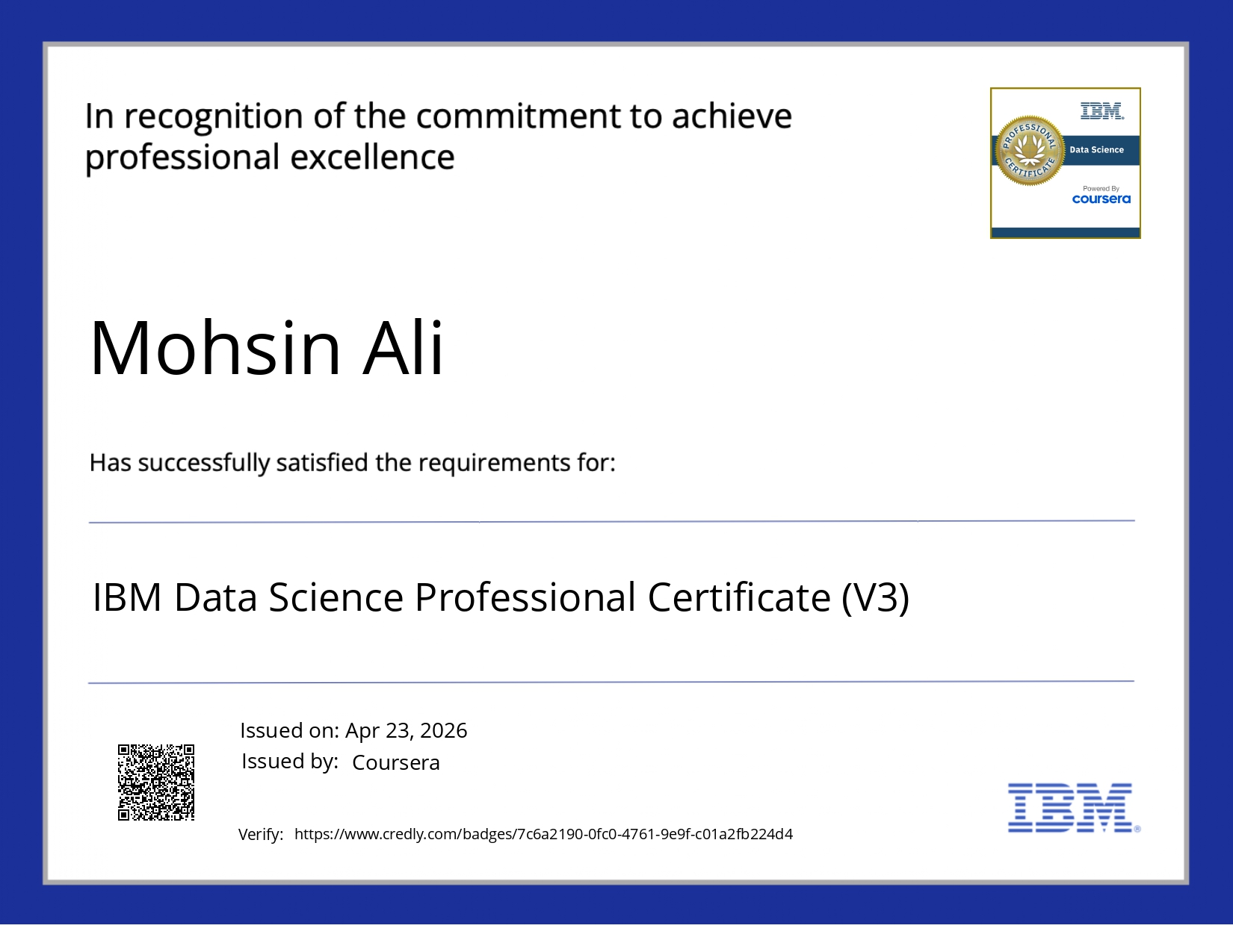 This certificate recognizes the successful completion of the IBM Data Science Professional Certificate, demonstrating commitment to professional excellence in data science.