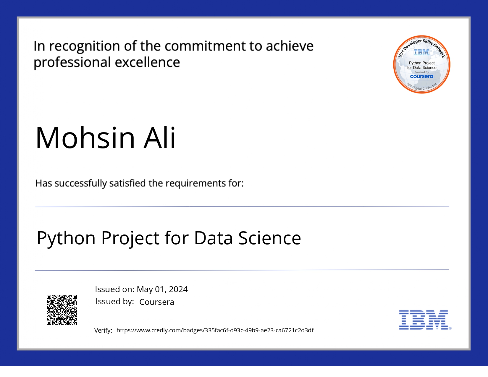 This certificate recognizes the successful completion of a Python project focused on data science, demonstrating practical application of data analysis skills.