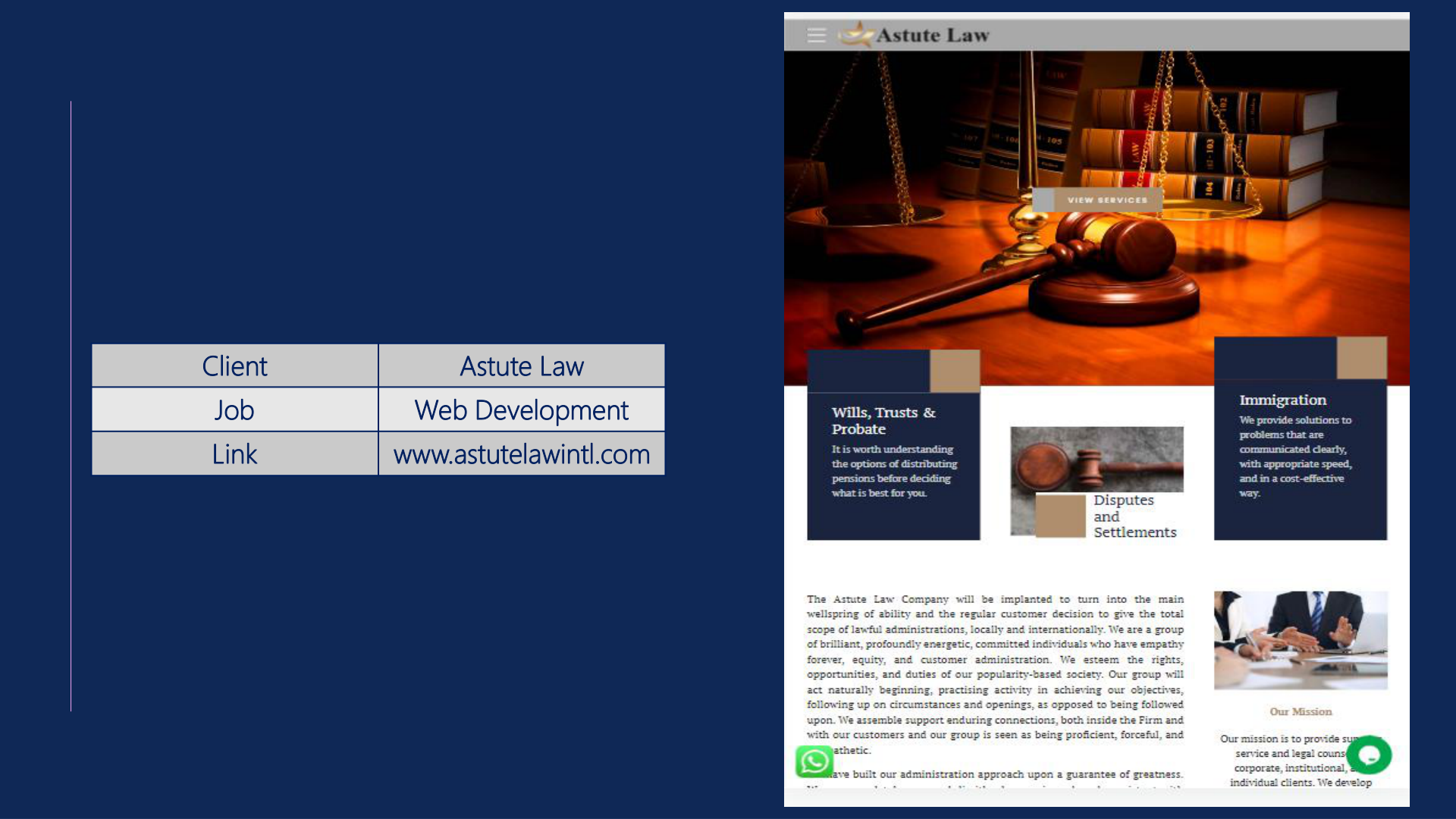 The website highlights services such as Wills, Trusts & Probate, Disputes and Settlements, and Immigration, providing clear explanations. It describes Astute Law as a group of brilliant, profoundly energetic, and committed individuals who provide comprehensive legal administration, valuing client rights and opportunities.
