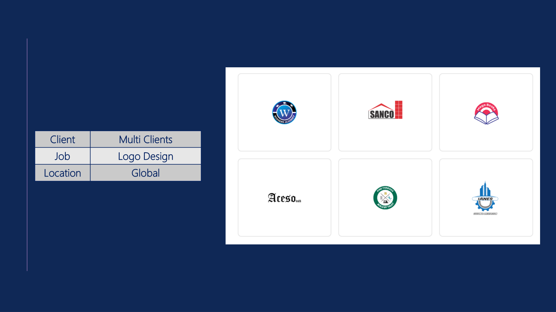 This page showcases a diverse portfolio of logos created for multiple clients, including 'Winners Academy,' 'Sanco,' 'Mega Book,' 'Aceso,' 'Fine Threads,' and 'Janes Customer Satisfaction.' Each logo reflects unique branding and design principles tailored to the client's identity and industry needs.